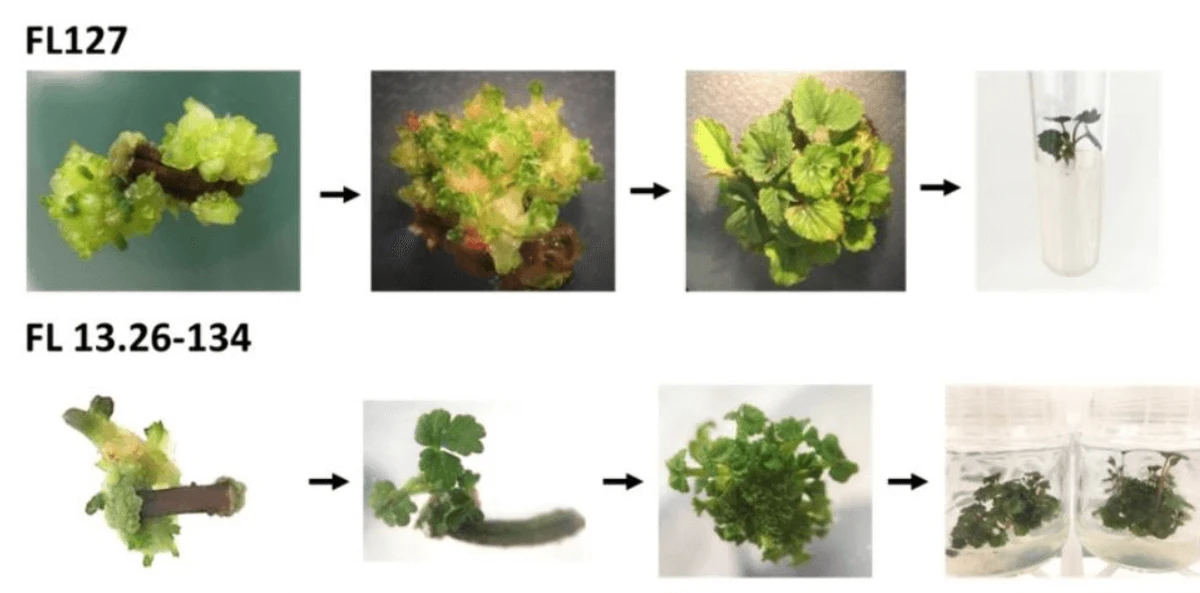 About one inch of petiole or stolon from the leaf-end or shoot-end, respectively, were collected from greenhouse grown plants and used for the tissue culture process. Optimal conditions for tissue culture medium, nutrient, and hormone were tested for the UF accessions. The runner (stolon) produced calli more vigorously than petiole segments. It takes about 14 weeks for Sweet Sensation® ‘Florida127’ and ‘Florida Brilliance’ (FL 13.26-134) to develop from embryogenic callus to young plantlet in rooting media (Figure 2). ‘Florida Brilliance’ (FL 13.26-134) produced more regenerated plants than Sweet Sensation® ‘Florida127’.