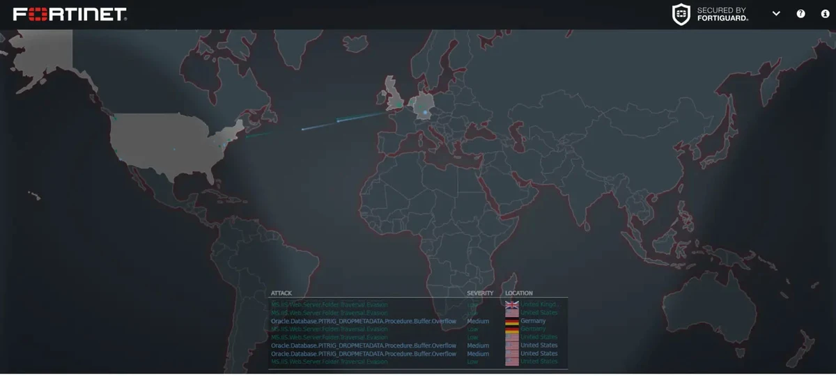 Leveraging data from Fortinet’s extensive network of security appliances, the map displays attack types, severity, and geographic locations.