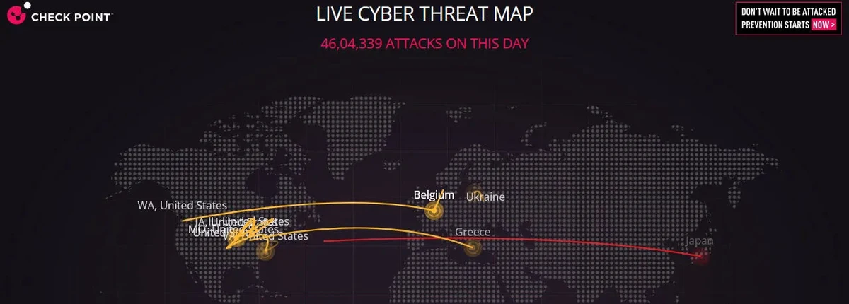 Check Point’s ThreatCloud Map offers a daily-updated, real-time visualization of global cyber attacks.
