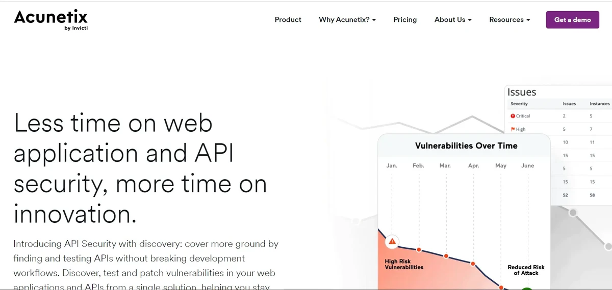 Acunetix is an automated web application and API security platform that scans websites and web applications for vulnerabilities such as SQL injection, cross-site scripting, and issues from the OWASP Top 10.