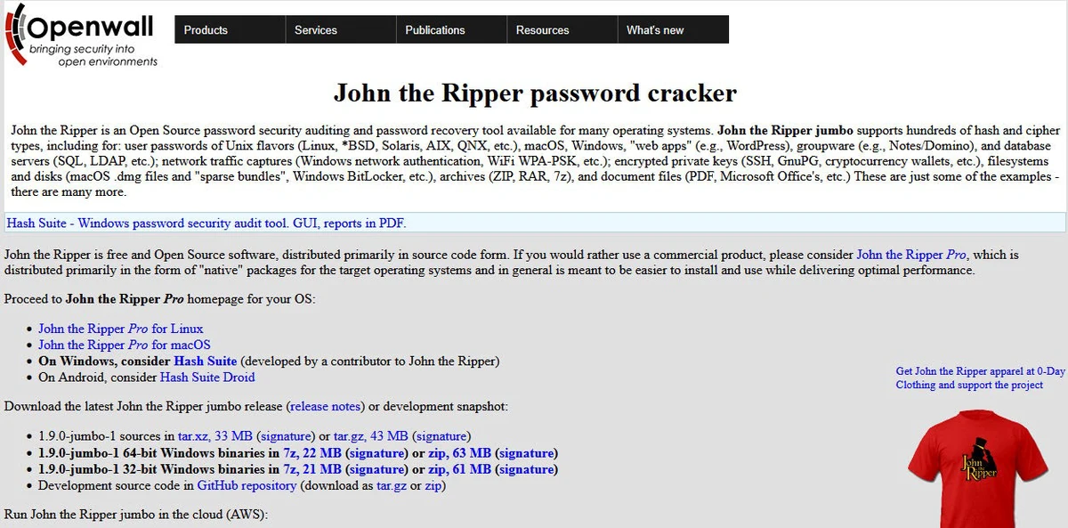 John the Ripper is a fast, open-source password cracking and security auditing tool available for Unix, Windows, macOS, and other platforms.