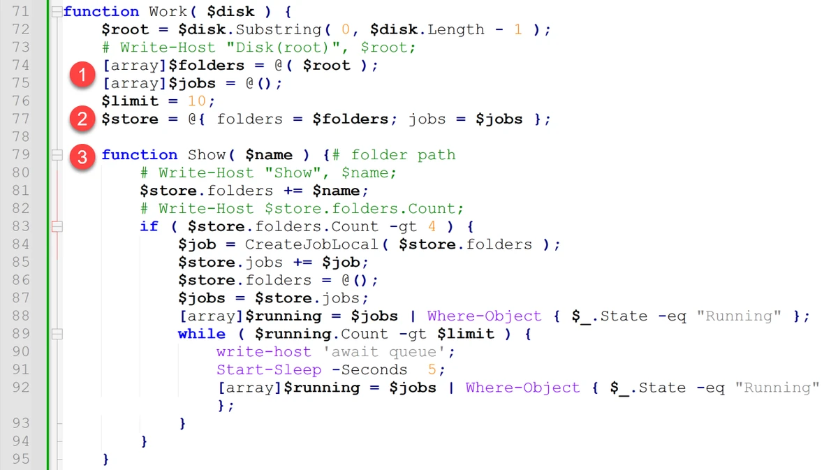 Every time the Work() function is called, the drive path ($disk) is received for searching and processing directories.