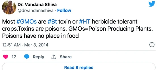 2. Shiva does not understand some basic science, e.g. saying: “Most #GMOs are #Bt toxin or #HT herbicide tolerant crops. Toxins are poisons. GMOs=Poison Producing Plants. Poisons have no place in food.”